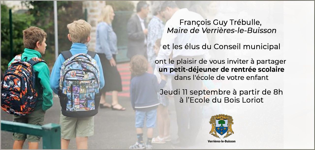 François Guy Trébulle , Maire de Verrières-le-Buisson et les élus du Conseil Municipal ont le plaisir de vous inviter à partager un petit-déjeuner de rentrée scolaire dans l'école de votre enfant Jeudi 11 septembre à partir de 8h à l'Ecole du Bois loriot.